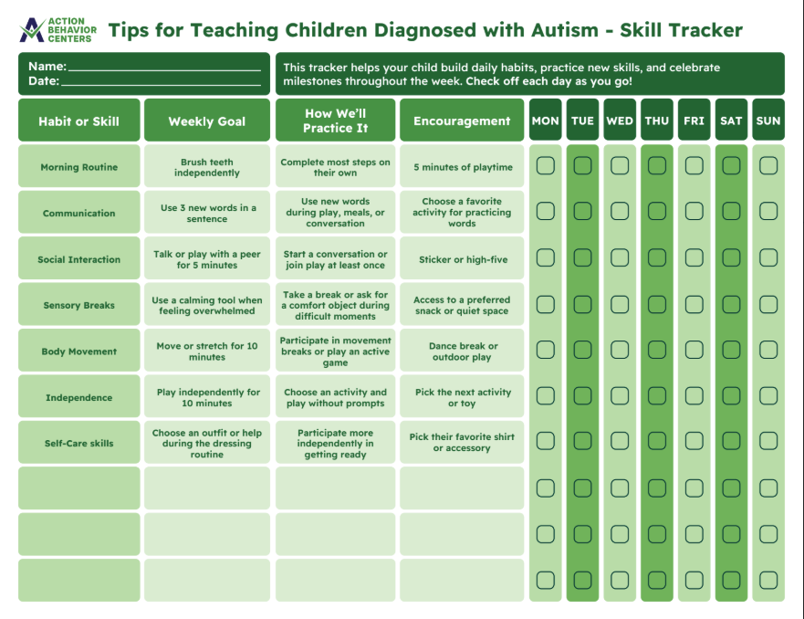 Building new skills takes time, practice, and encouragement, and it helps to have a simple way to stay organized along the way. We created a skill-tracking tool you can print, hang on the fridge, and use during everyday routines. It gives families a clear place to write goals and track progress throughout the week.